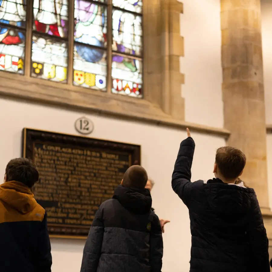 In deze rondleiding maken de kinderen kennis met de kerk, een aantal mooie glazen en een paar bijzondere figuren uit de kerk. Aan de hand van een koffer vol voorwerpen vertellen de kinderen zelf waarom juist dit voorwerp bij het glas of bij de persoon past. De rondleiders haken daarop in door iets te vertellen, een opdracht te geven of door ze specifiek iets te laten zoeken.